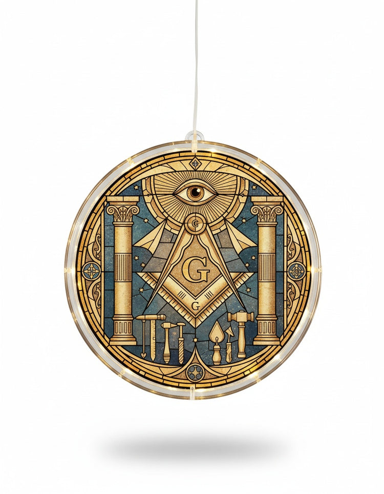 A premium Freemason-themed acrylic led hanging light lamp (circle frame) featuring traditional Masonic symbols and craftsmanship. This personalized item is designed specifically for Brothers of the Craft.