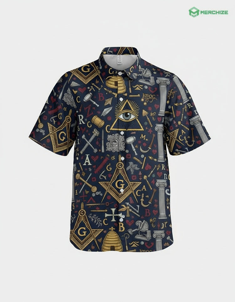 A premium Freemason-themed all-over print button down shirt featuring traditional Masonic symbols and craftsmanship. This personalized item is designed specifically for Brothers of the Craft.