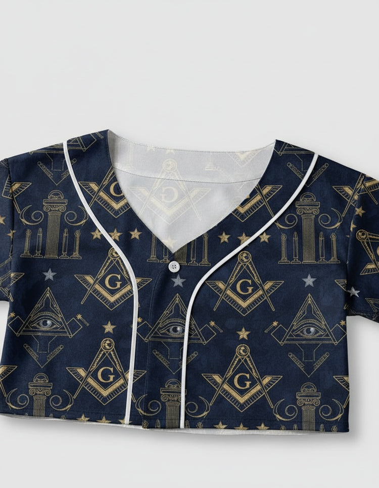 A premium Freemason-themed all-over print crop top baseball jersey featuring traditional Masonic symbols and craftsmanship. This personalized item is designed specifically for Brothers of the Craft.