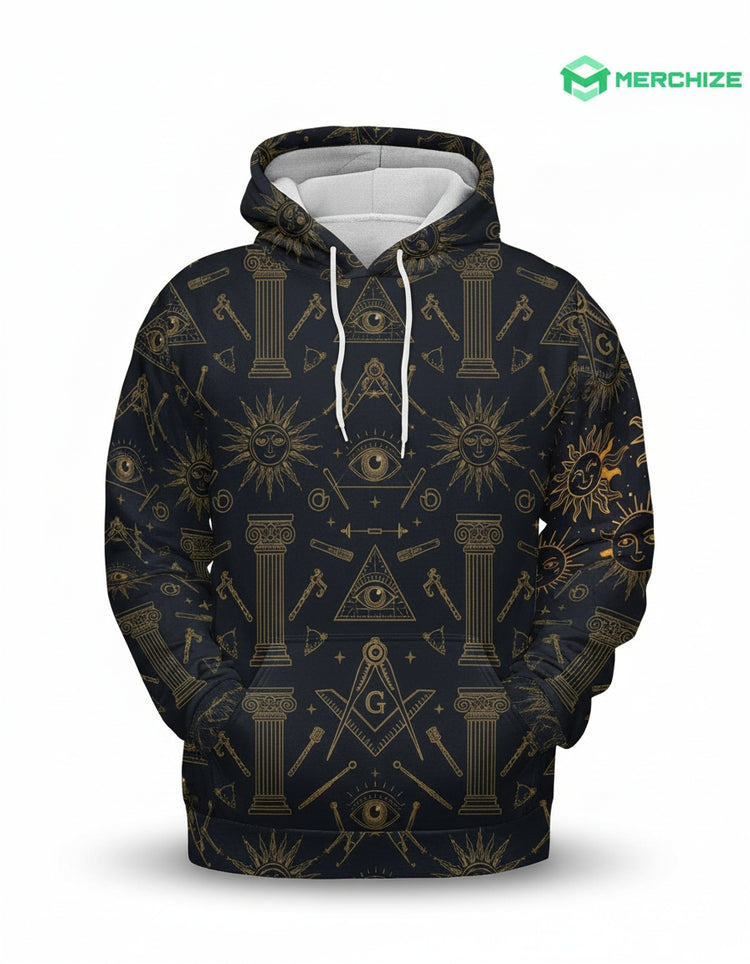 A premium Freemason-themed all-over print hoodie (lightweight) featuring traditional Masonic symbols and craftsmanship. This personalized item is designed specifically for Brothers of the Craft.