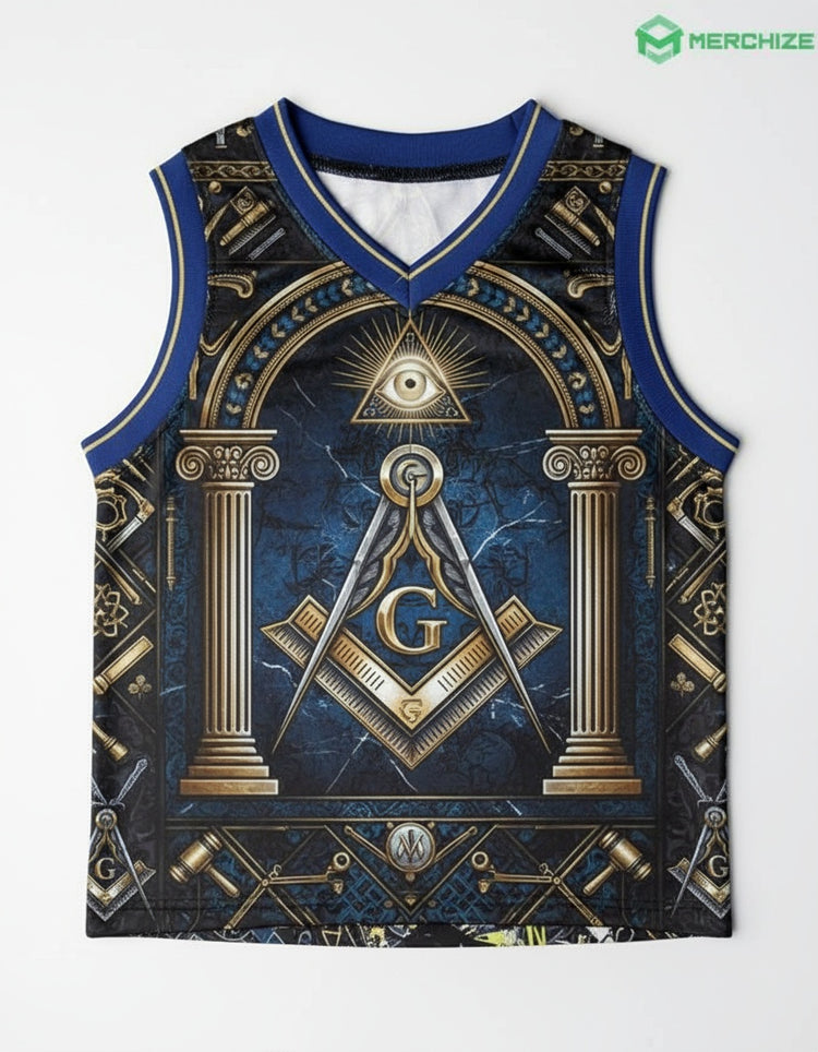 A premium Freemason-themed all-over print kid and youth v-neck sleeveless jersey tank top featuring traditional Masonic symbols and craftsmanship. This personalized item is designed specifically for Brothers of the Craft.