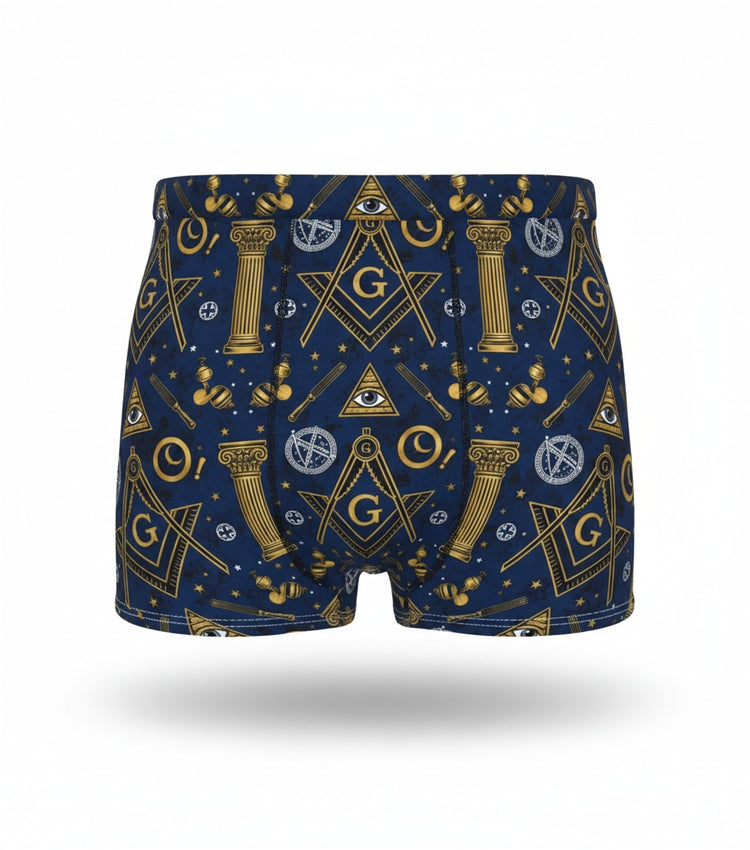 A premium Freemason-themed all-over print men's boxer briefs featuring traditional Masonic symbols and craftsmanship. This personalized item is designed specifically for Brothers of the Craft.