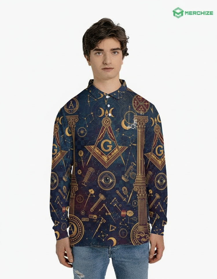 A premium Freemason-themed all-over print men's long sleeve polo shirt (midweight) featuring traditional Masonic symbols and craftsmanship. This personalized item is designed specifically for Brothers of the Craft.