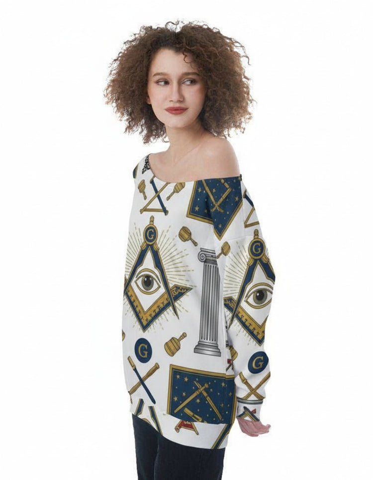 A premium Freemason-themed all-over print oversized women's off-shoulder sweatshirt featuring traditional Masonic symbols and craftsmanship. This personalized item is designed specifically for Brothers of the Craft.