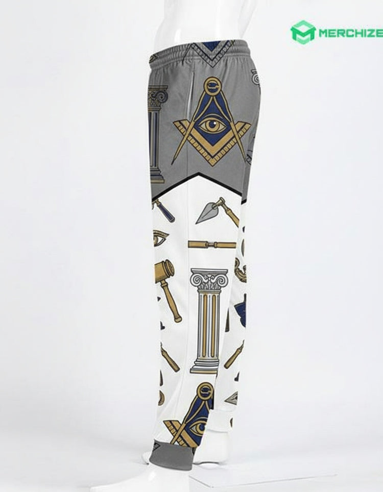 A premium Freemason-themed all-over print sweatpants featuring traditional Masonic symbols and craftsmanship. This personalized item is designed specifically for Brothers of the Craft.