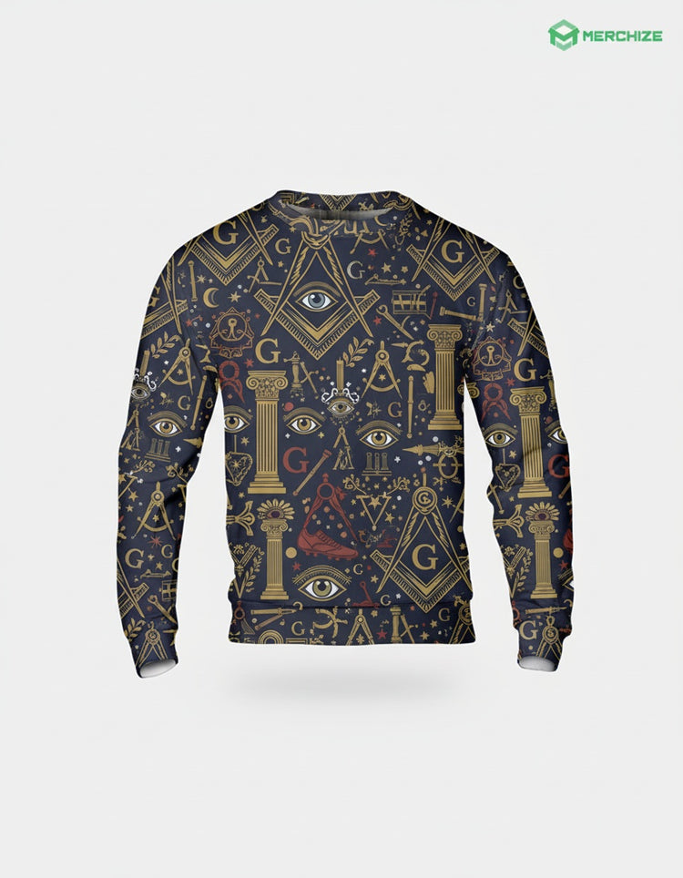 A premium Freemason-themed all-over print sweatshirt (lightweight) featuring traditional Masonic symbols and craftsmanship. This personalized item is designed specifically for Brothers of the Craft.