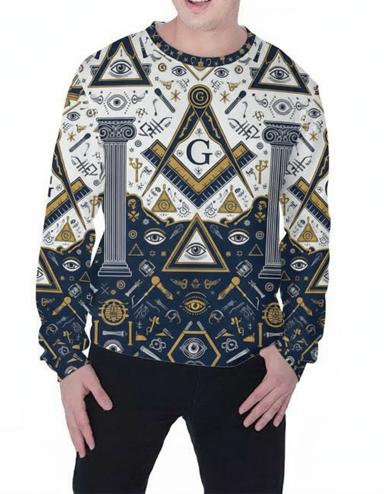 A premium Freemason-themed all-over print sweatshirt (midweight) featuring traditional Masonic symbols and craftsmanship. This personalized item is designed specifically for Brothers of the Craft.