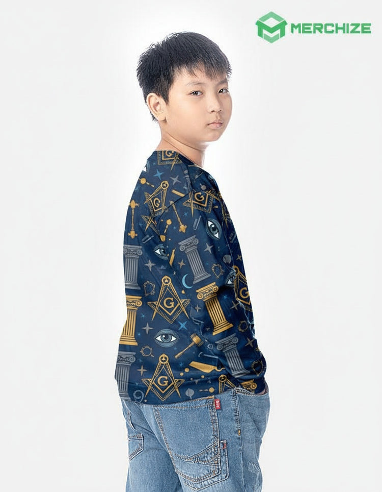 A premium Freemason-themed all-over print youth sweatshirt (lighweight) featuring traditional Masonic symbols and craftsmanship. This personalized item is designed specifically for Brothers of the Craft.