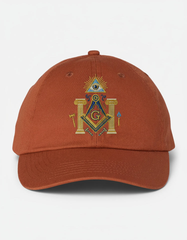 A premium Freemason-themed bio-washed classic dad hat vc300a featuring traditional Masonic symbols and craftsmanship. This personalized item is designed specifically for Brothers of the Craft.