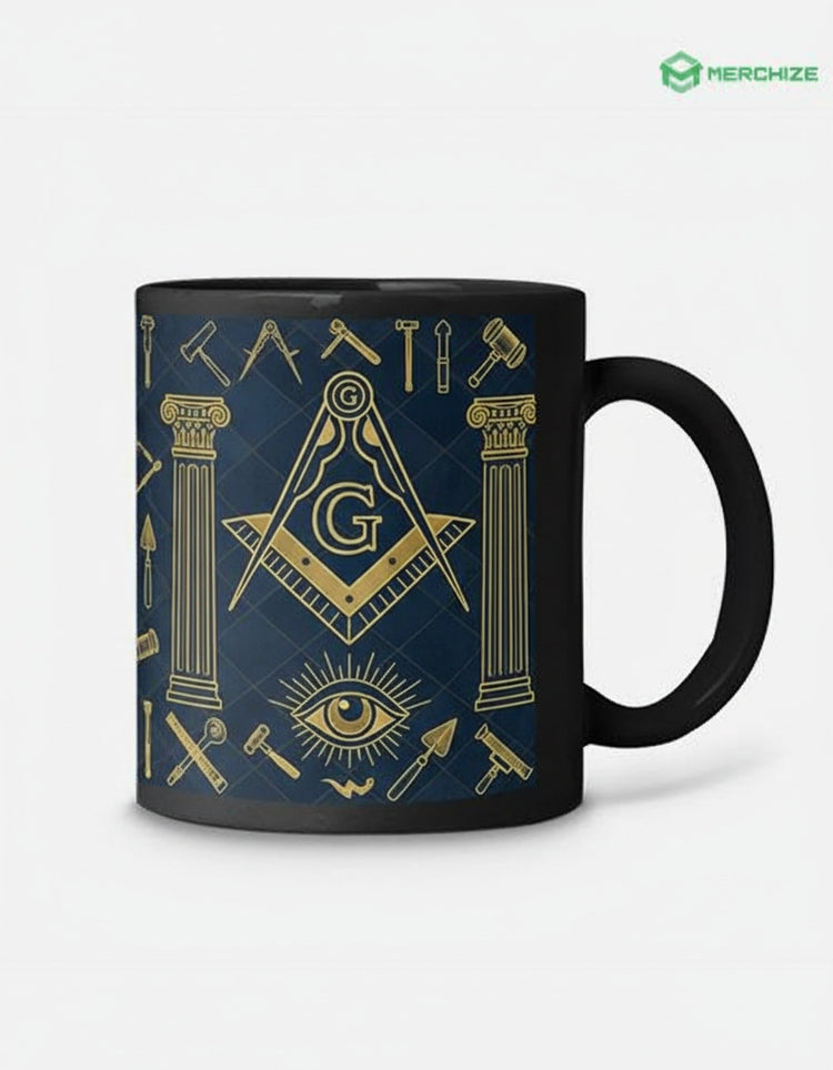 A premium Freemason-themed ceramic mug (11 oz) featuring traditional Masonic symbols and craftsmanship. This personalized item is designed specifically for Brothers of the Craft.