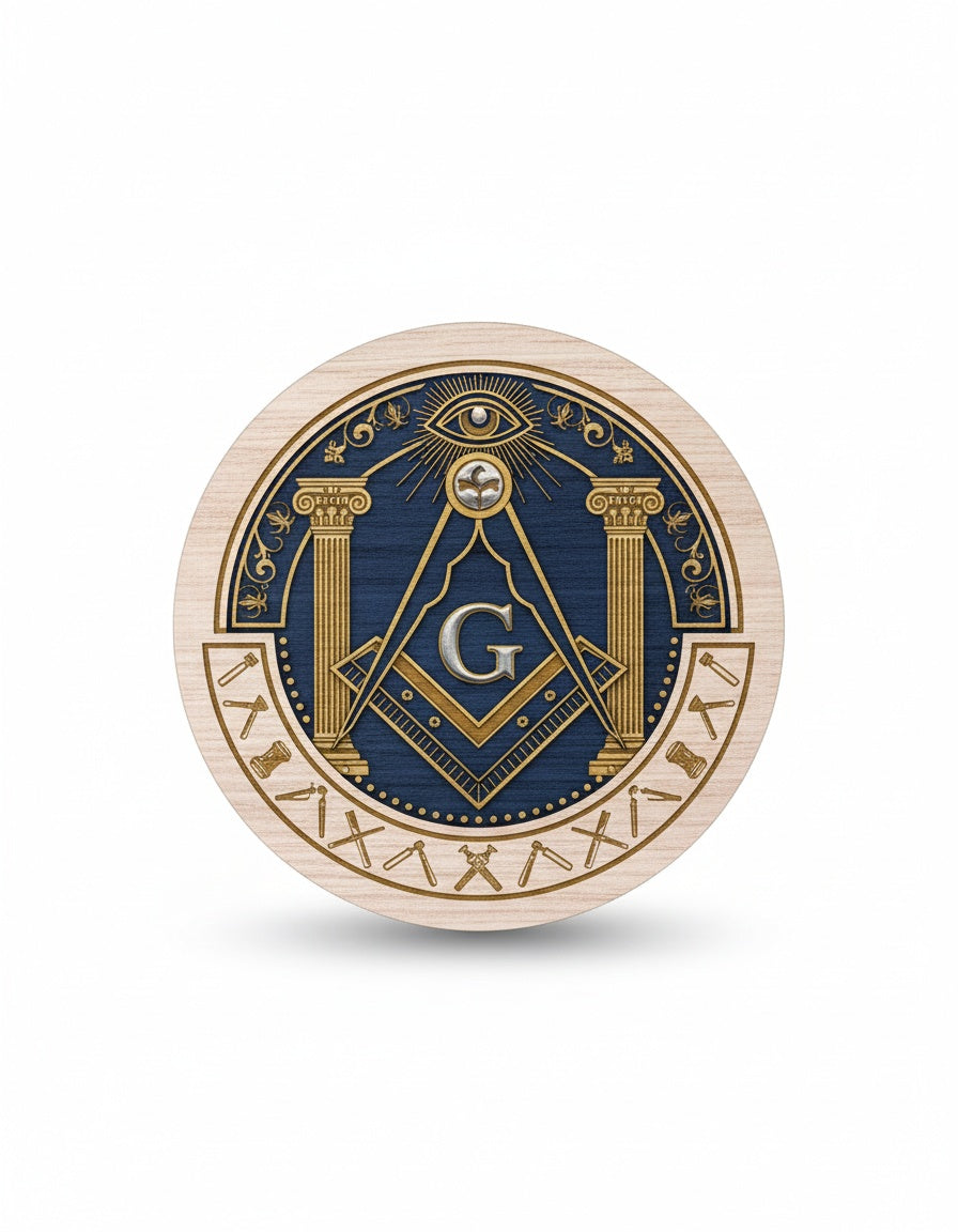 A premium Freemason-themed custom shape 2-layer wooden car clip featuring traditional Masonic symbols and craftsmanship. This personalized item is designed specifically for Brothers of the Craft.