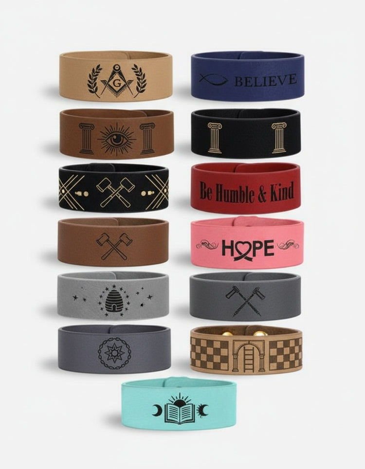 A premium Freemason-themed engraved leatherette cuff bracelet featuring traditional Masonic symbols and craftsmanship. This personalized item is designed specifically for Brothers of the Craft.