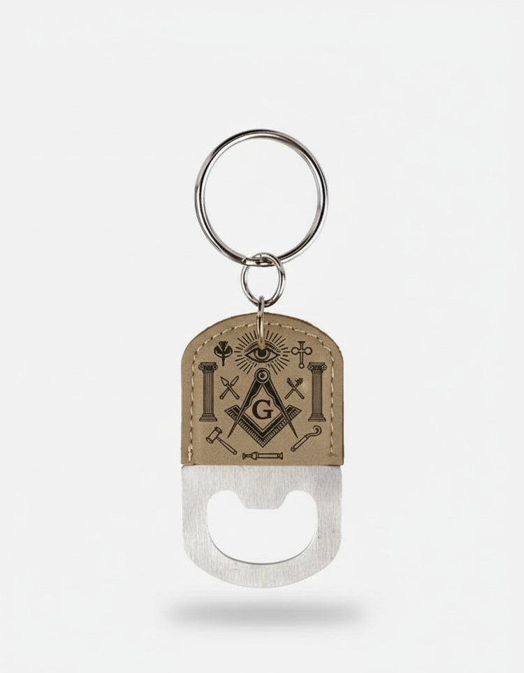 A premium Freemason-themed engraved oval leatherette bottle opener keychain featuring traditional Masonic symbols and craftsmanship. This personalized item is designed specifically for Brothers of the Craft.