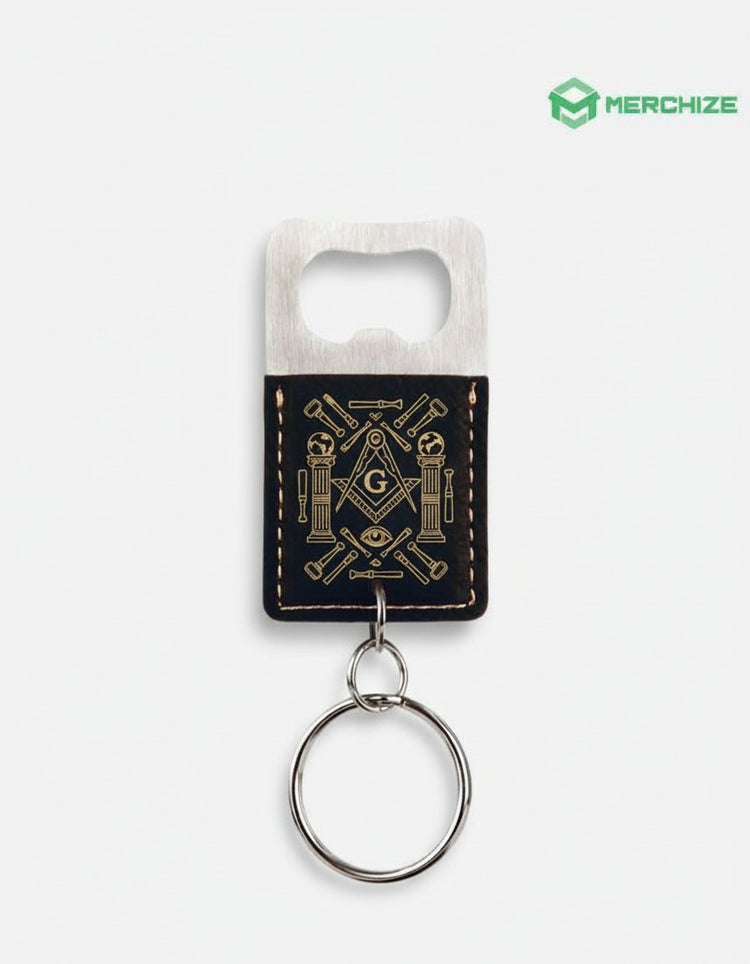 A premium Freemason-themed engraved rectangle leatherette bottle opener keychain featuring traditional Masonic symbols and craftsmanship. This personalized item is designed specifically for Brothers of the Craft.