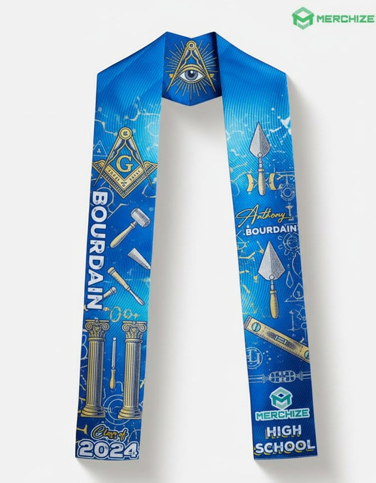 A premium Freemason-themed graduation stole featuring traditional Masonic symbols and craftsmanship. This personalized item is designed specifically for Brothers of the Craft.