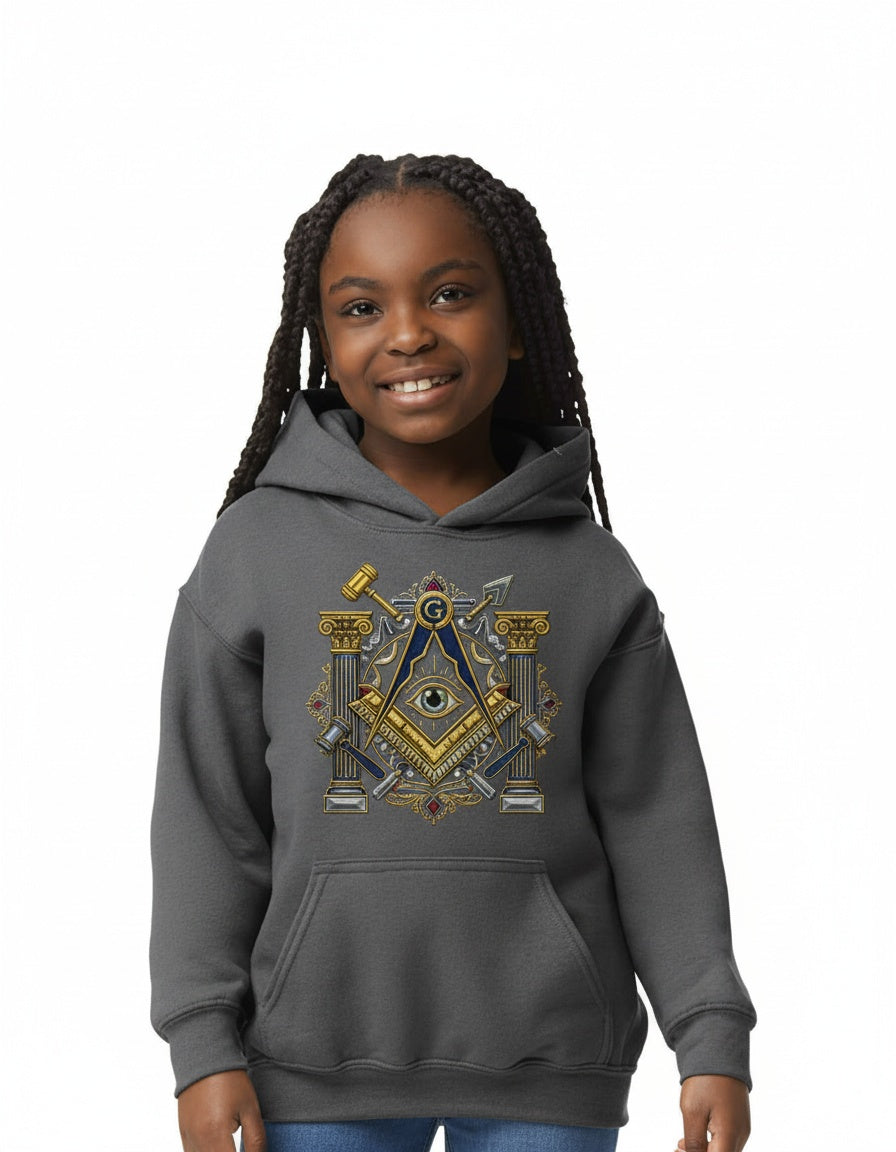 A premium Freemason-themed kid hoodie gildan 18500b featuring traditional Masonic symbols and craftsmanship. This personalized item is designed specifically for Brothers of the Craft.