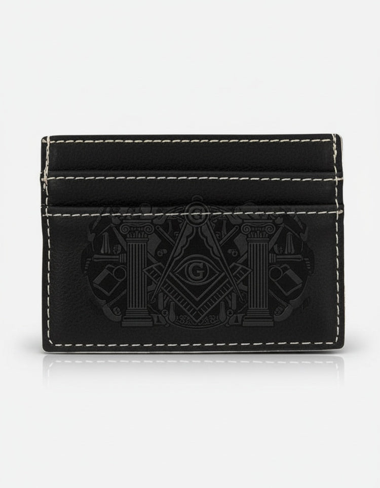 A premium Freemason-themed leatherette wallet clip featuring traditional Masonic symbols and craftsmanship. This personalized item is designed specifically for Brothers of the Craft.