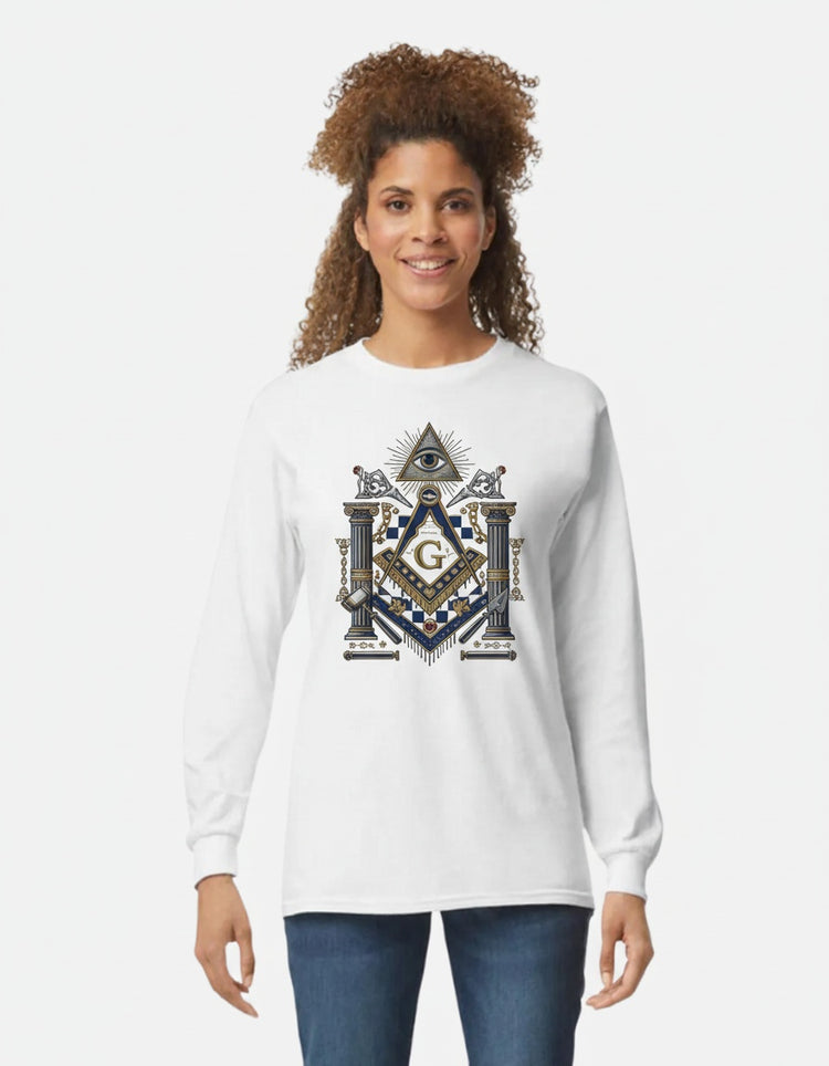 A premium Freemason-themed long sleeve t-shirt gildan 2400 featuring traditional Masonic symbols and craftsmanship. This personalized item is designed specifically for Brothers of the Craft.