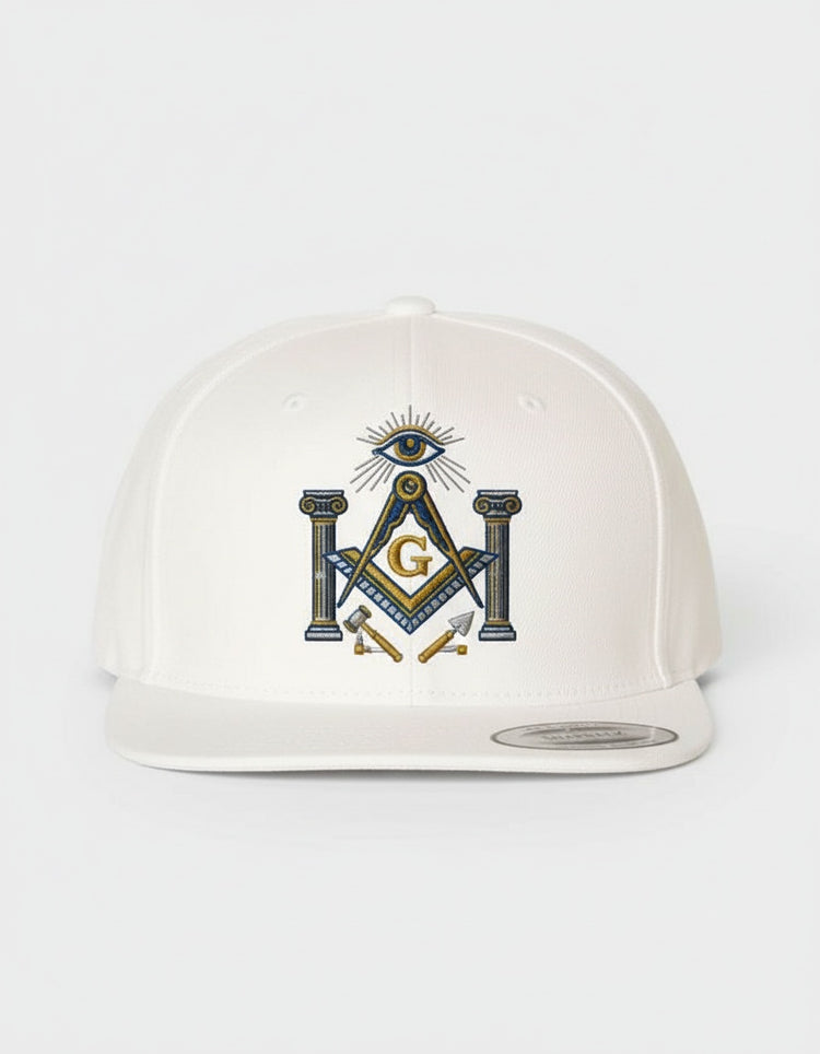 A premium Freemason-themed premium flat bill snapback cap 6089m featuring traditional Masonic symbols and craftsmanship. This personalized item is designed specifically for Brothers of the Craft.