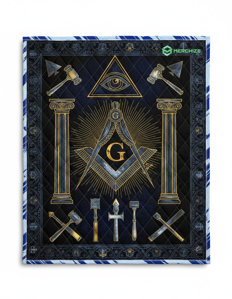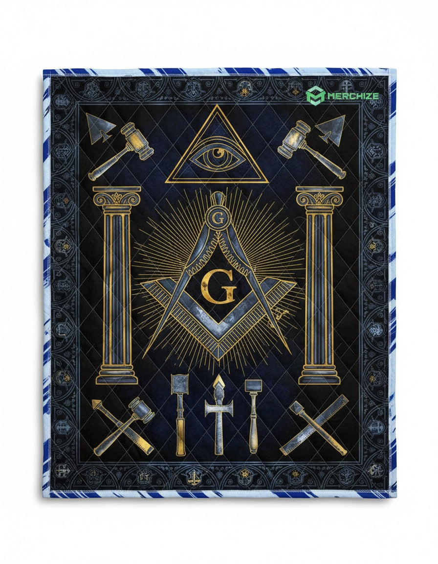 A premium Freemason-themed premium quilt blanket featuring traditional Masonic symbols and craftsmanship. This personalized item is designed specifically for Brothers of the Craft.