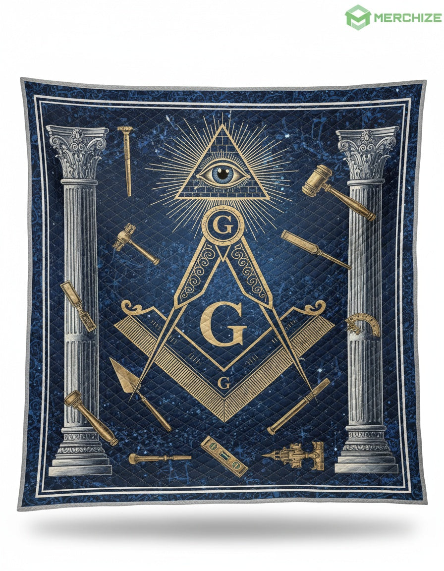 A premium Freemason-themed quilt bedding set featuring traditional Masonic symbols and craftsmanship. This personalized item is designed specifically for Brothers of the Craft.