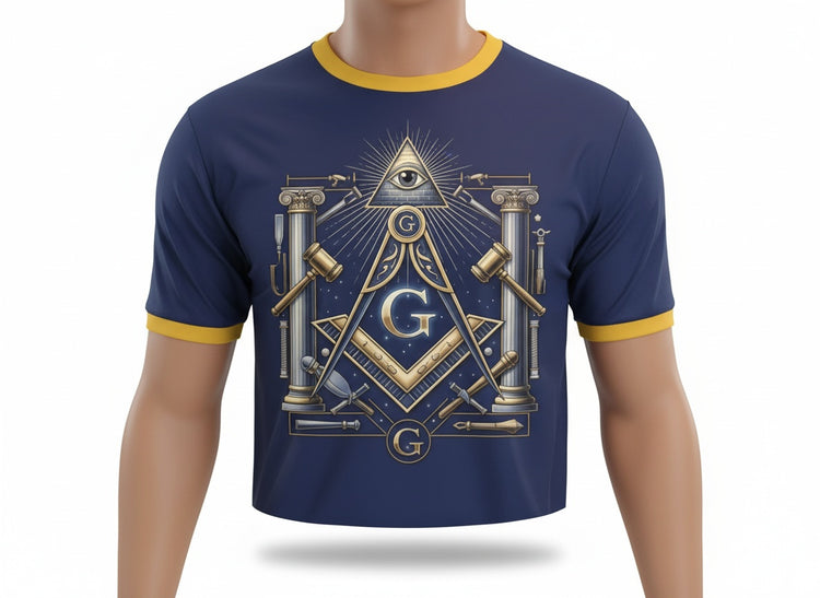 A premium Freemason-themed ringer t-shirt featuring traditional Masonic symbols and craftsmanship. This personalized item is designed specifically for Brothers of the Craft.