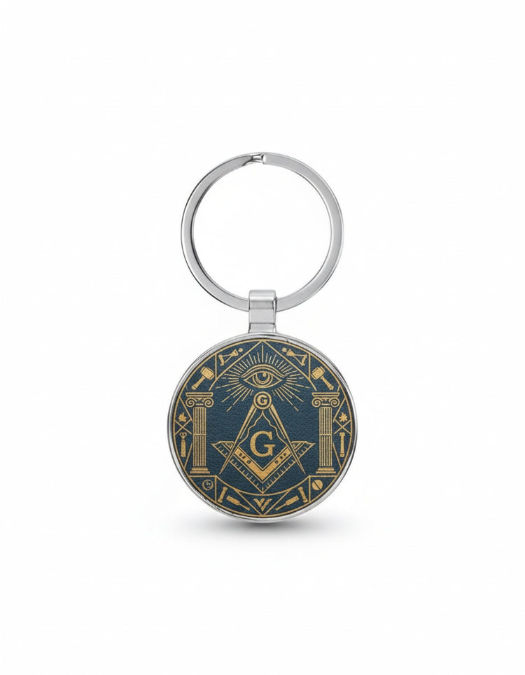 A premium Freemason-themed round leatherette and metal keychain featuring traditional Masonic symbols and craftsmanship. This personalized item is designed specifically for Brothers of the Craft.