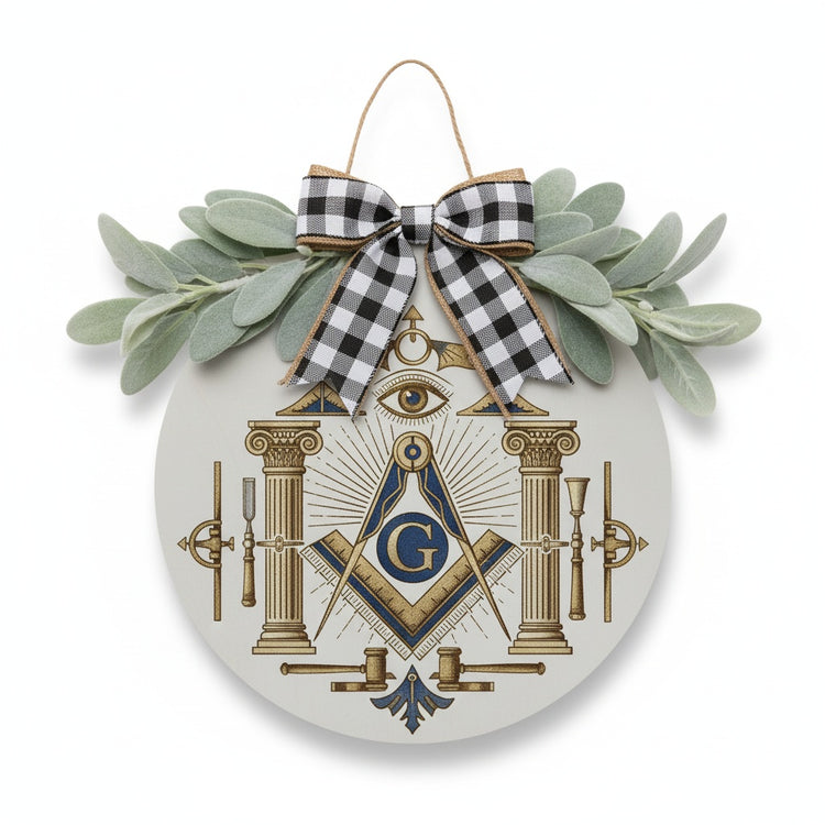 A premium Freemason-themed round wood sign featuring traditional Masonic symbols and craftsmanship. This personalized item is designed specifically for Brothers of the Craft.