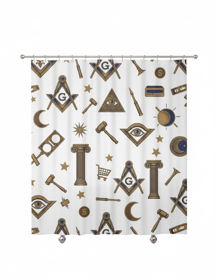 A premium Freemason-themed shower curtain featuring traditional Masonic symbols and craftsmanship. This personalized item is designed specifically for Brothers of the Craft.