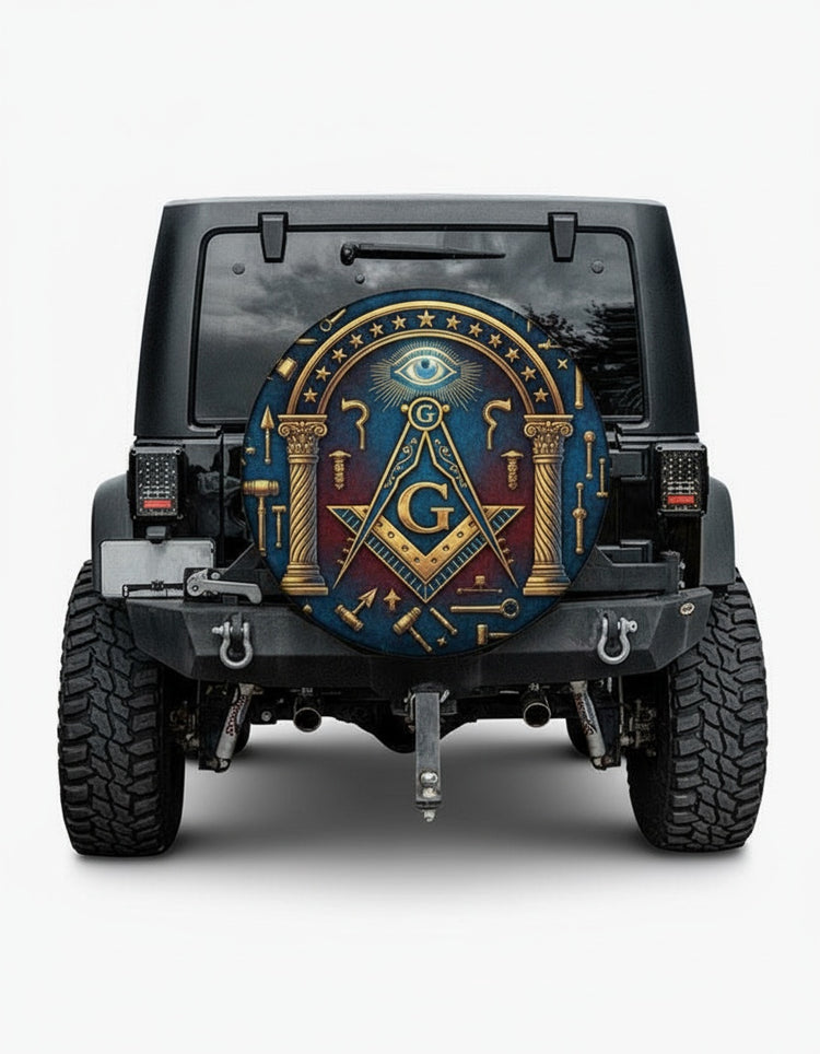 A premium Freemason-themed spare tire cover with backup camera hole featuring traditional Masonic symbols and craftsmanship. This personalized item is designed specifically for Brothers of the Craft.