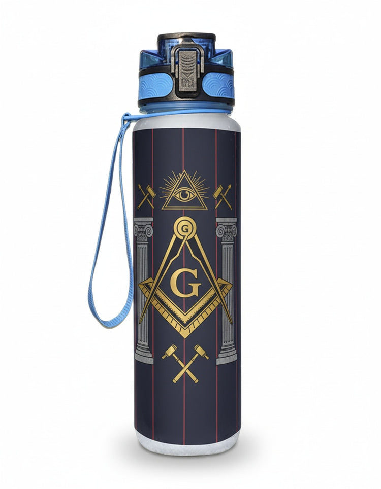A premium Freemason-themed sport water bottle 32oz featuring traditional Masonic symbols and craftsmanship. This personalized item is designed specifically for Brothers of the Craft.