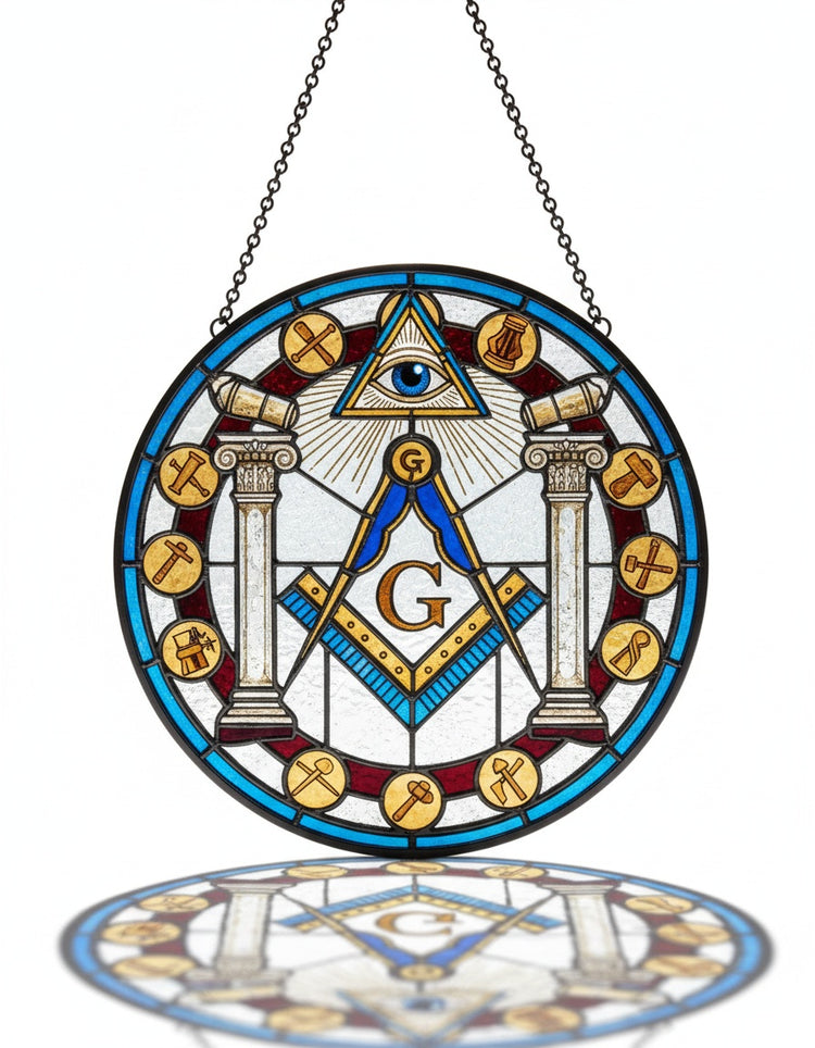 A premium Freemason-themed stained glass suncatcher for window hanging featuring traditional Masonic symbols and craftsmanship. This personalized item is designed specifically for Brothers of the Craft.