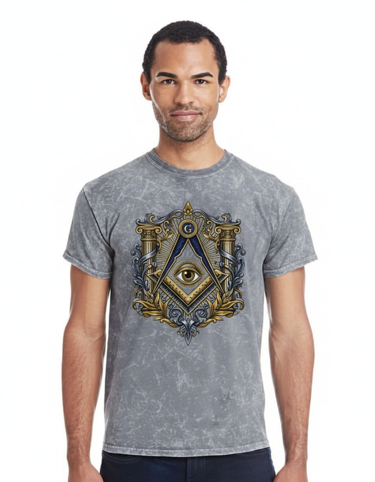 A premium Freemason-themed unisex mineral wash t-shirt colortone 1300 featuring traditional Masonic symbols and craftsmanship. This personalized item is designed specifically for Brothers of the Craft.