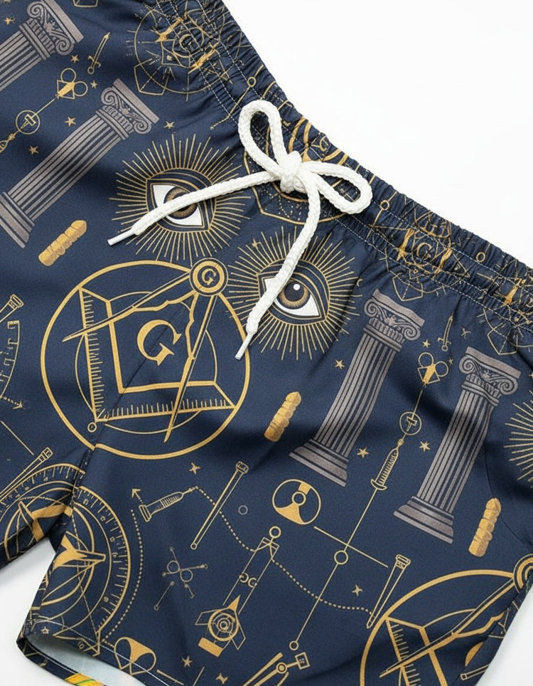 A premium Freemason-themed women's board shorts featuring traditional Masonic symbols and craftsmanship. This personalized item is designed specifically for Brothers of the Craft.